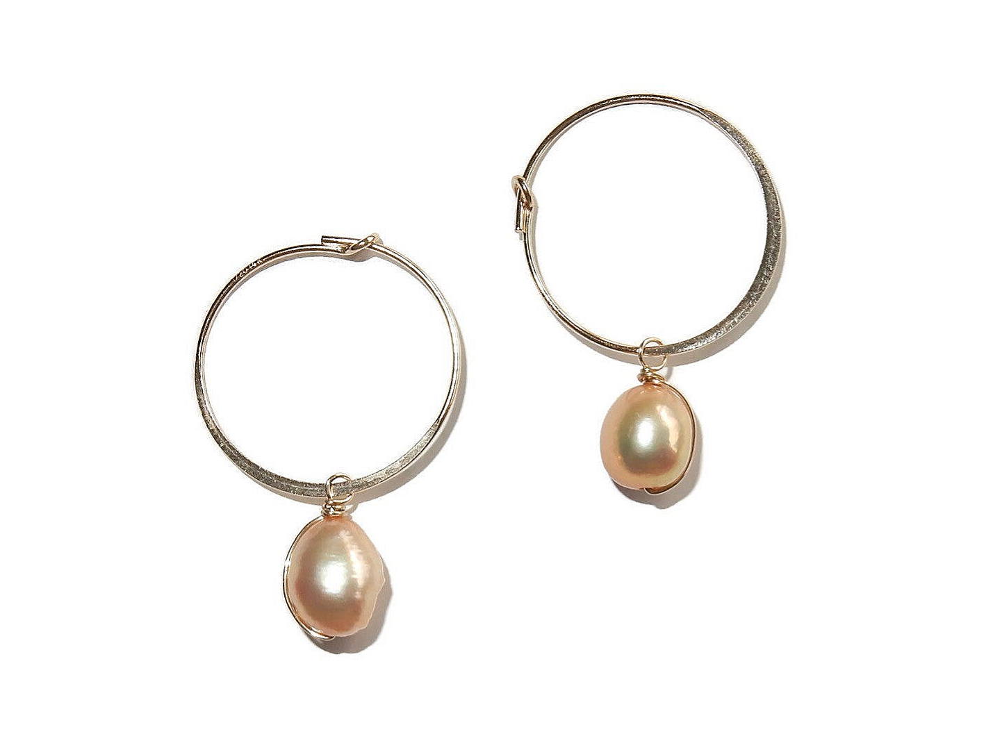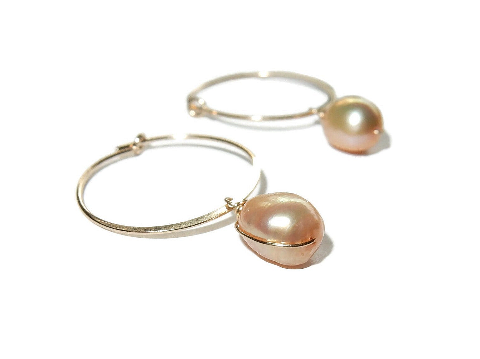 20 or 30 mm flattened hoop with a 12 mm irregular salmon freshwaterpearl, wired in goldfill