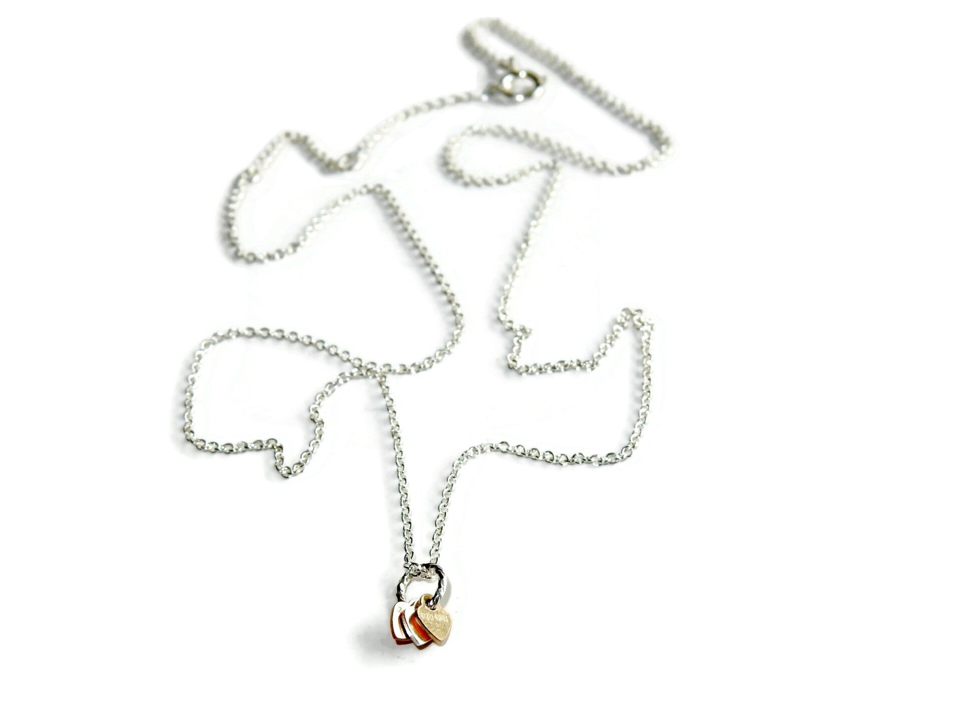 Charm with three tiny (3 mm) hearts in 14K/20 yellow, rosegold and .925 silver on a sparkling ring of 5 mm.