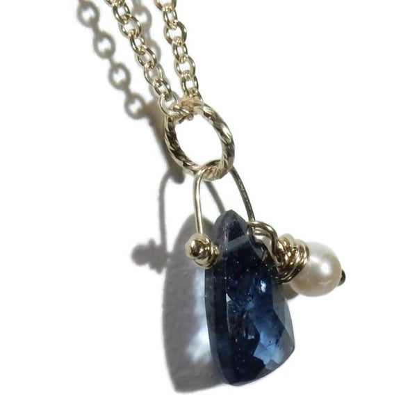 On this necklace, a beautiful shaped Kyanite gemstone (10x7 mm) and a small 2 mm fresh seawater pearl are attached. The colour of Kyanite is very special, somewhere between blue, green and turquoise. Both charms are messy wired and attached to a sparkling 5 mm ring, thus enabling them to be replaced by (or supplemented with) other charms (see our charmbar).
