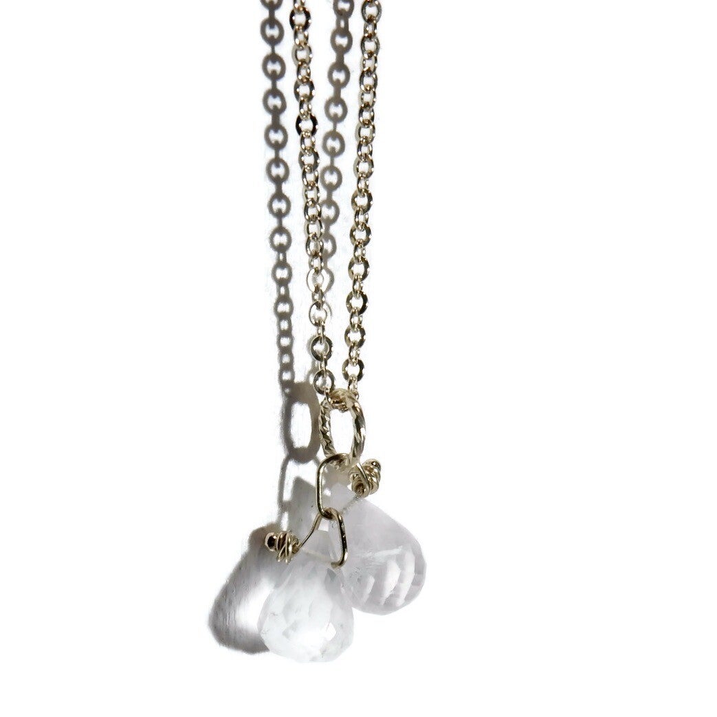 On this necklace, two delicate rosequartz wired drops (each abt 7 mm) attached to a sparkling 5 mm ring, thus enabling them to be replaced by (or supplemented with) other charms (see our charmbar).