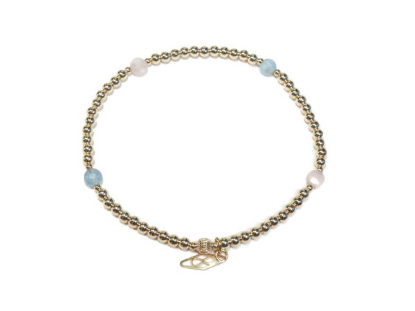 flexbracelet with 3 mm shiny beads, four discs in aquamarine & rosequartz and a 4 mm patterned bead.