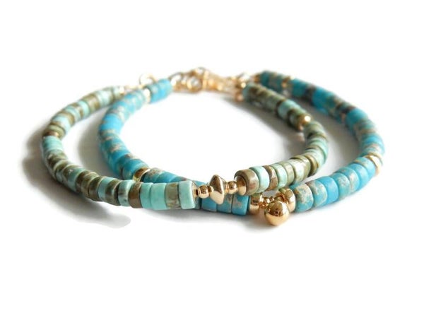 4x2 mm mat heishi Jasper beads and 14K/20 gold beads.