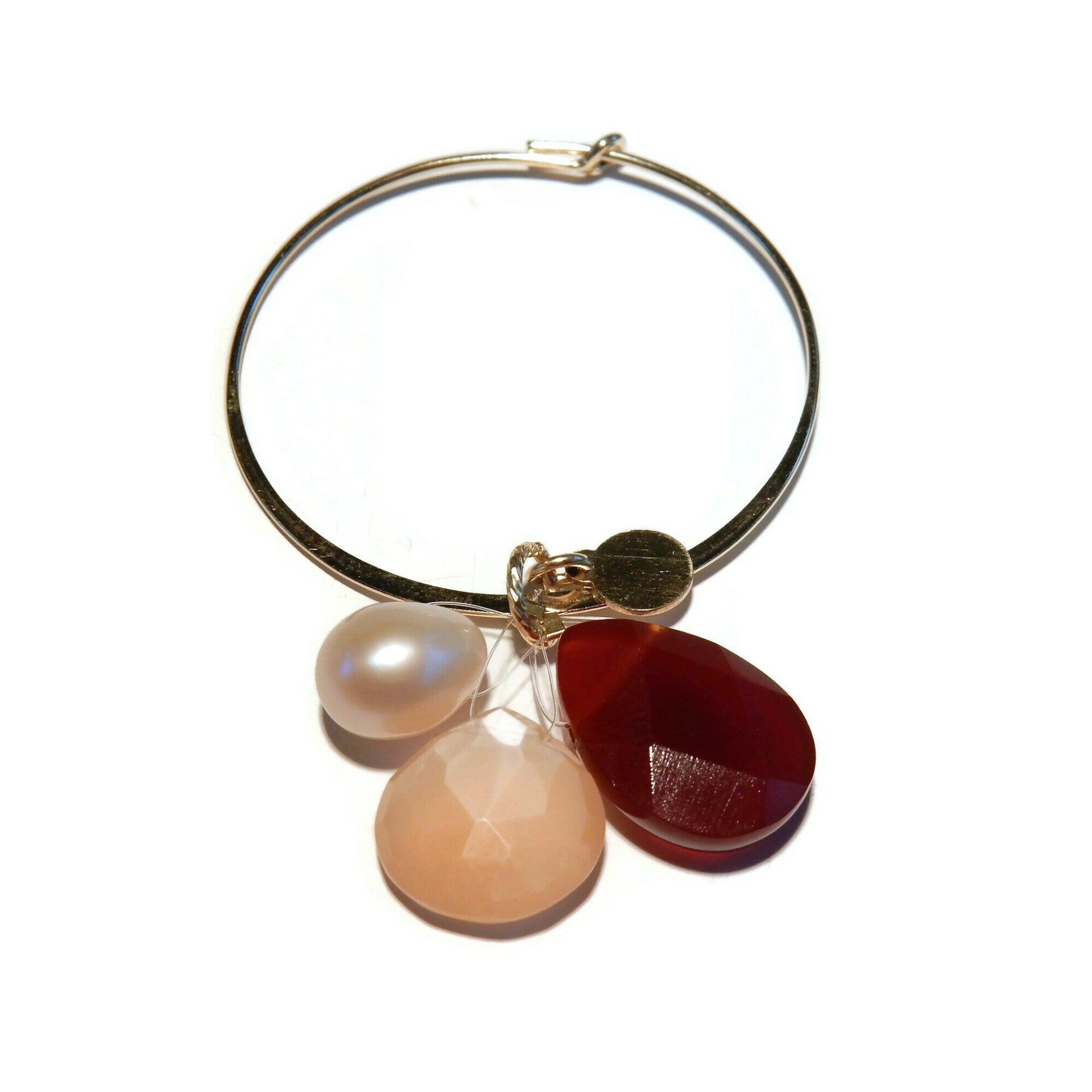 Cornelian, Sunstone, pearl and a 14K/20 gold qualitylabel on a flattened hoop