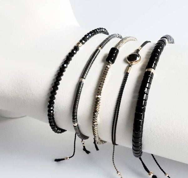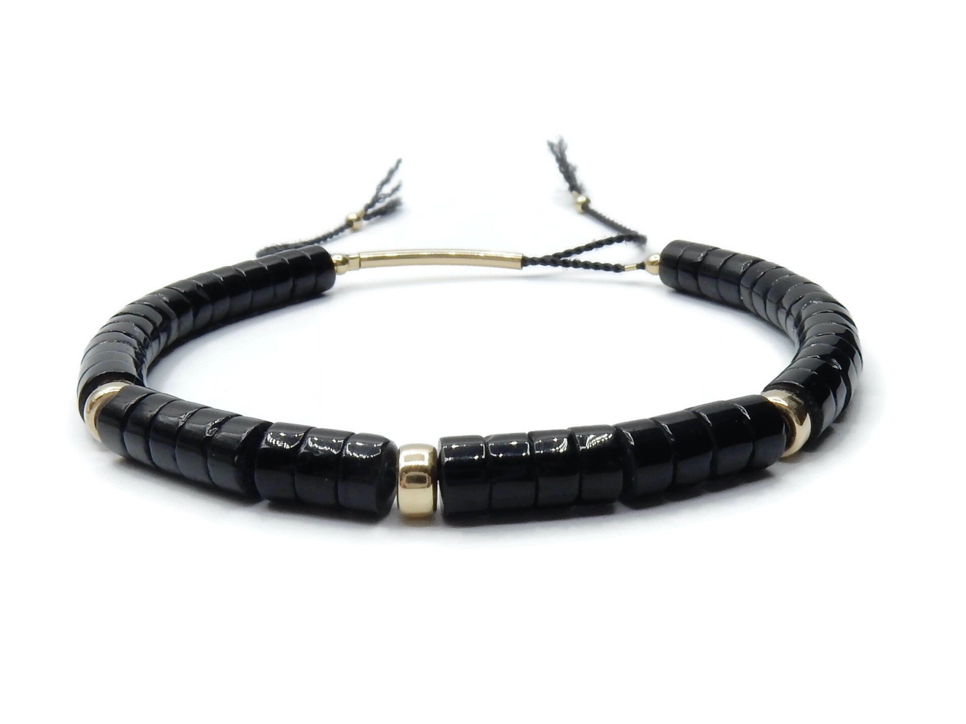 4 mm shiny black Agate heishibeads and 4 mm 14K/20 gold rondelles.
