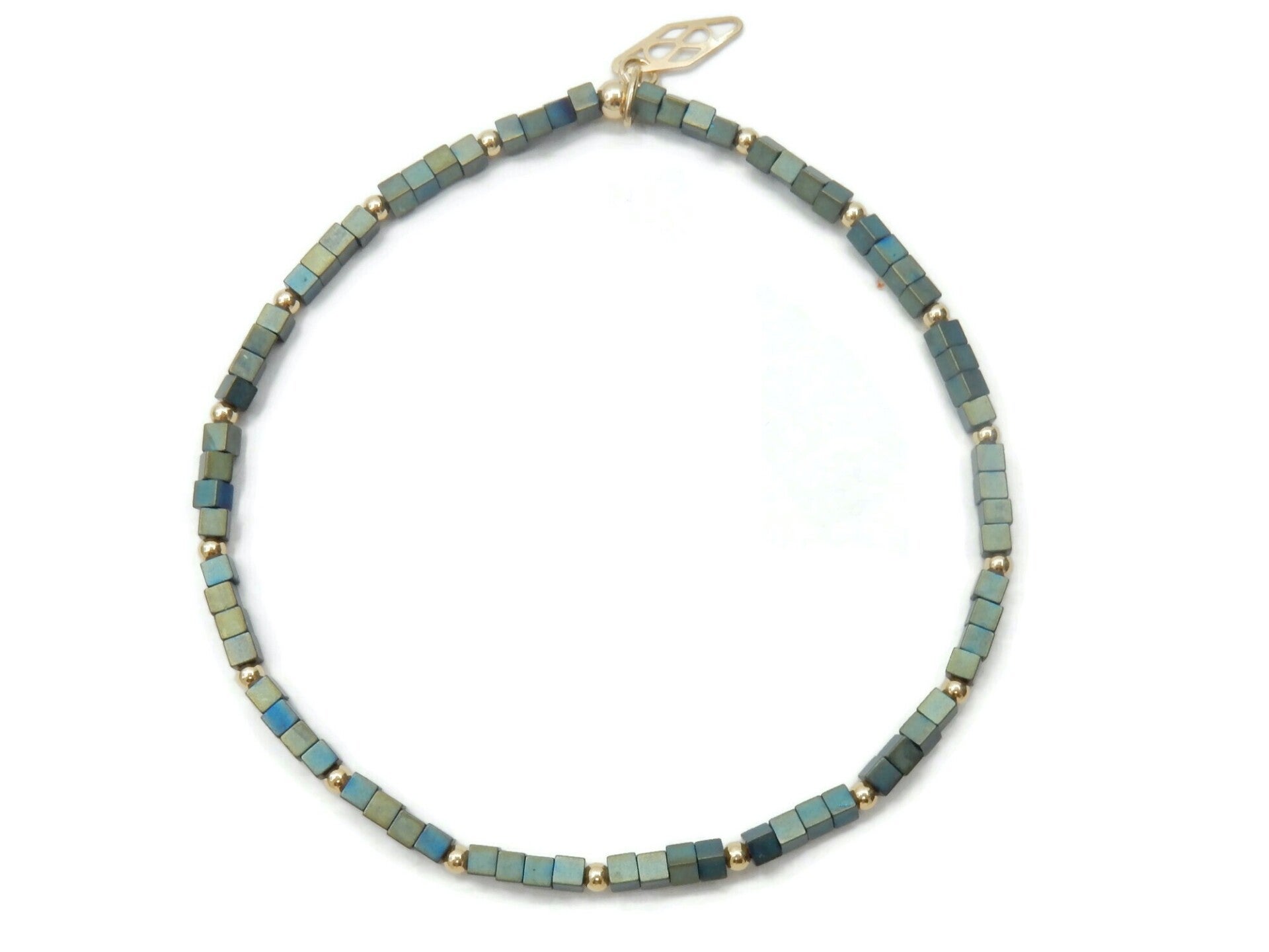 2 mm square blue/green Hematite stones and accents in 14K/20 gold