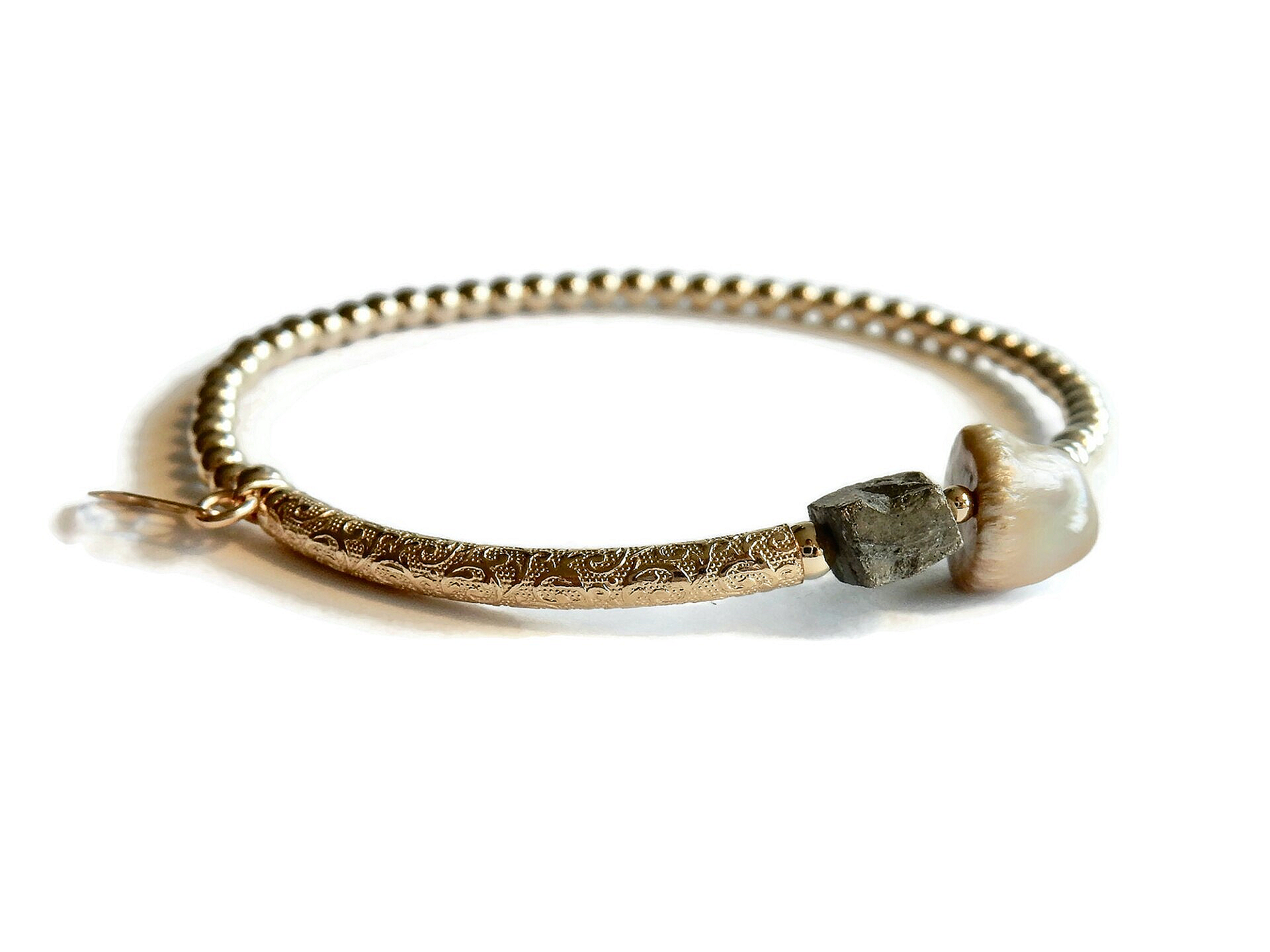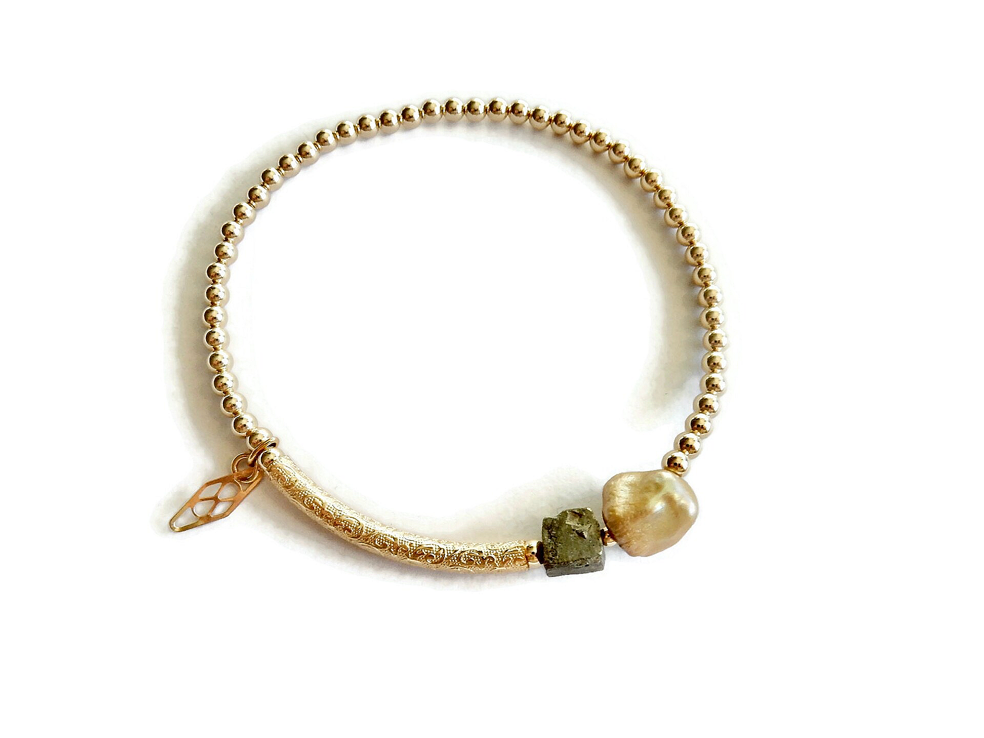 3 mm goldbeads, an irregularly shaped freshwaterpearl, rough Pyrite and a patterned tube. All in 14K/20 gold.