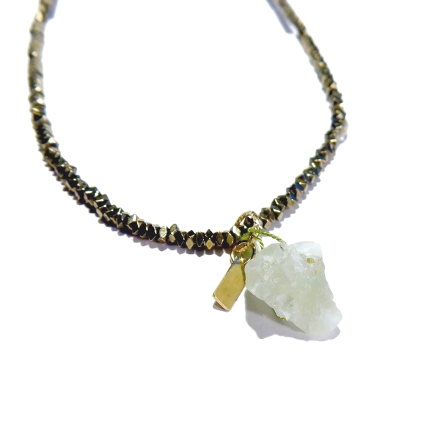 unpolished green Amethyst (abt 10 mm) attached to a green silk cord & a 3x8 mm bar, both connected to a 6 mm sparkling ring, to be attached to our necklaces and chokers (with clasp)